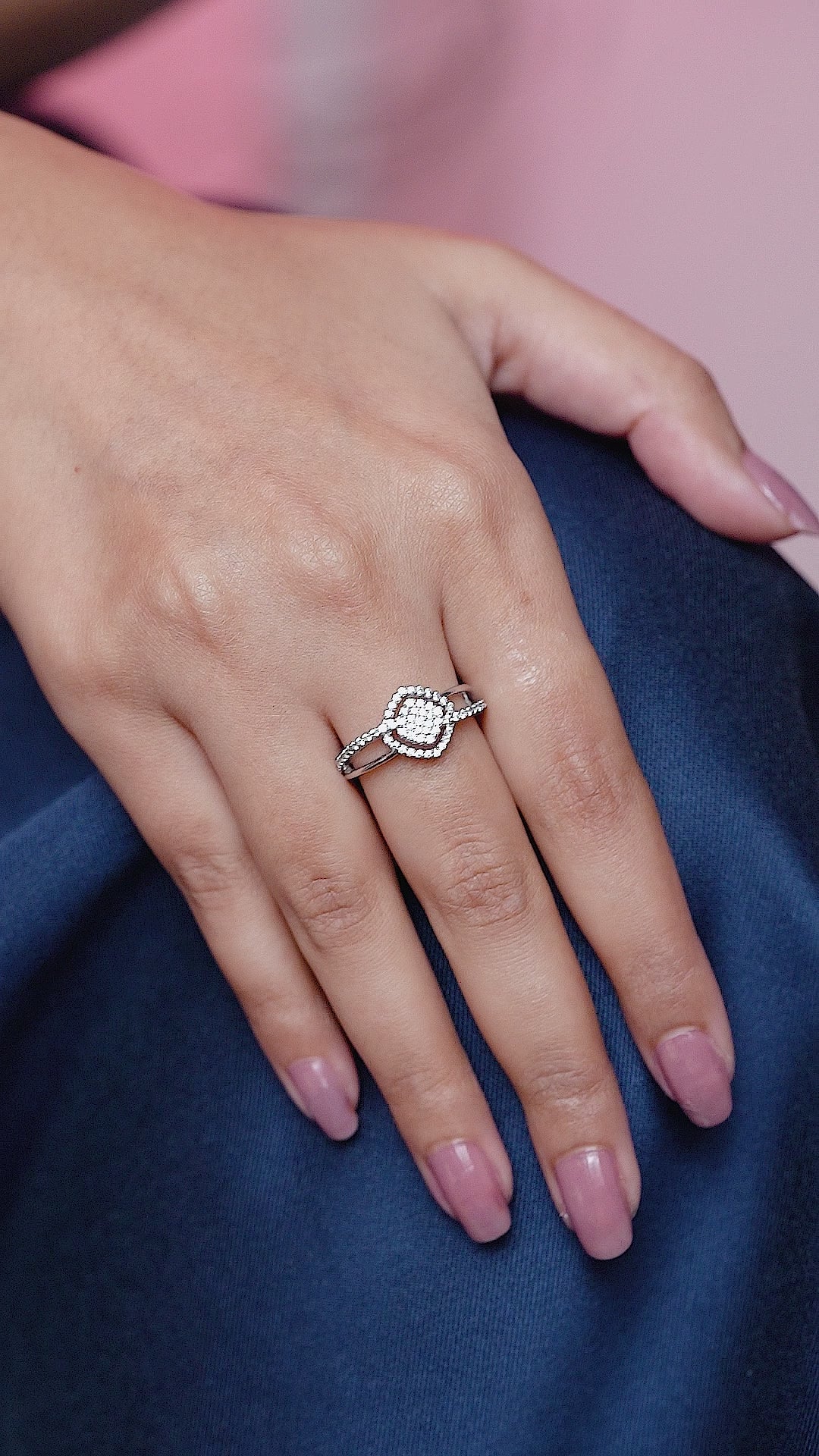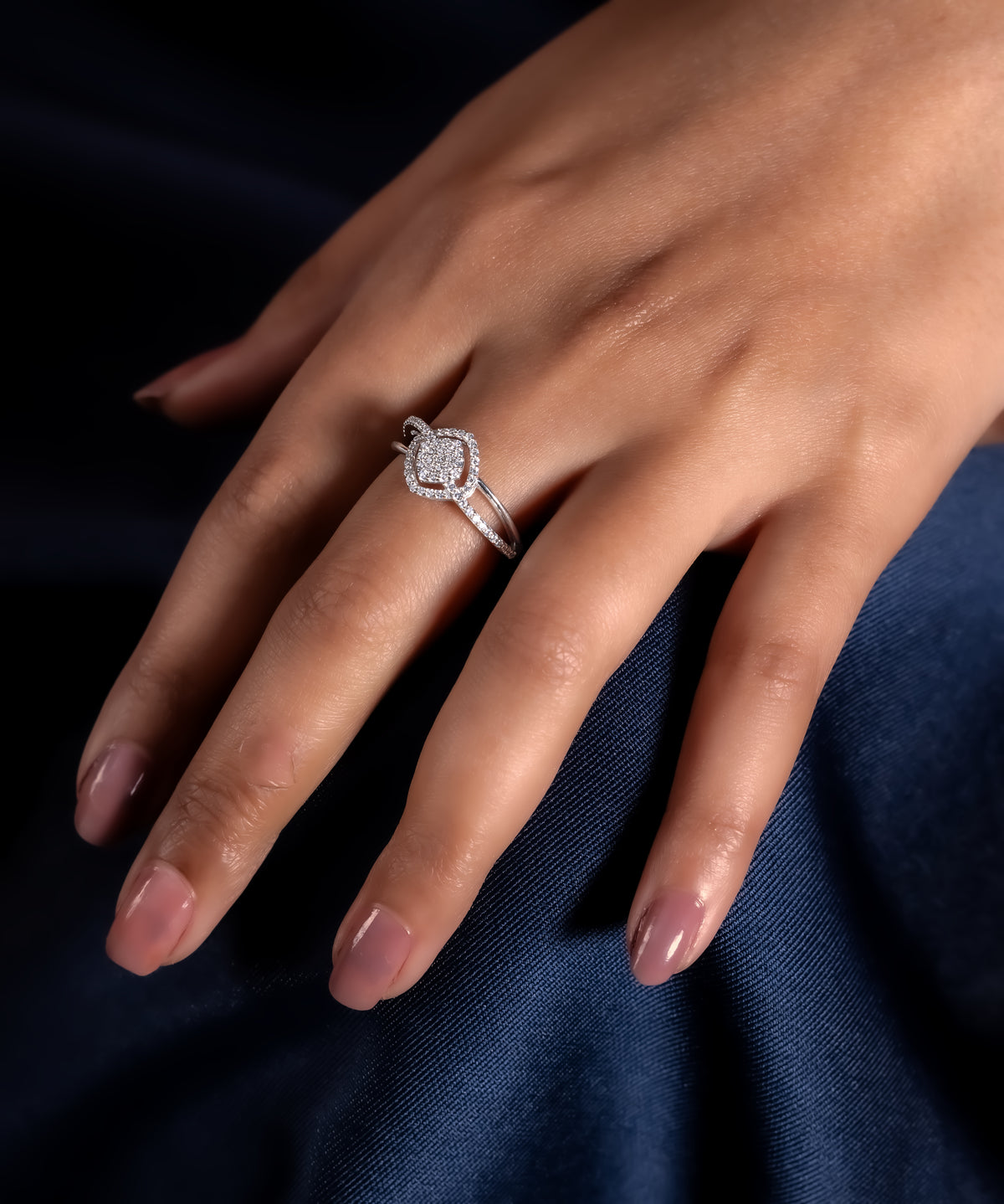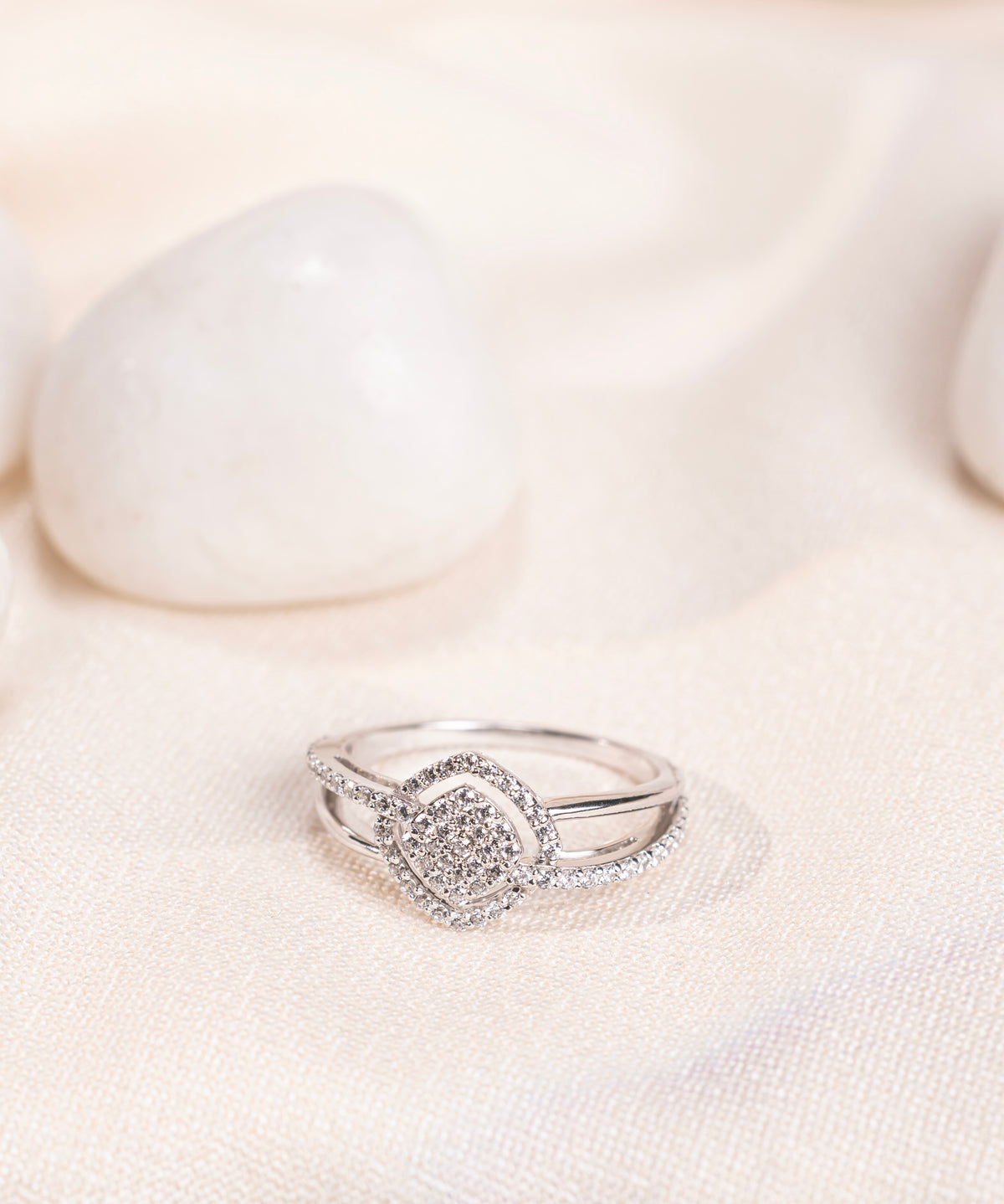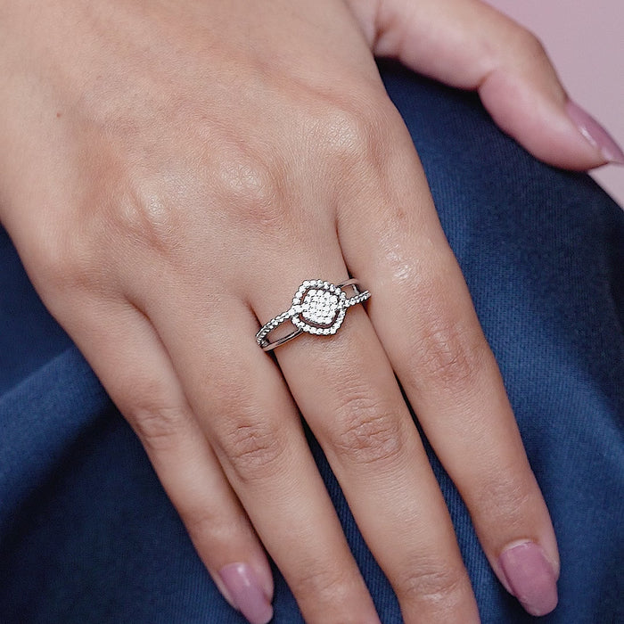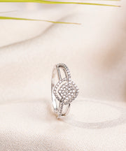 Illuminate your style with the Orabella Gleam, expertly crafted from 925 sterling silver and adorned with sparkling moissanite diamonds. Its intertwined dual-row band highlights a central halo cluster, creating an elegant and radiant design. Perfect for special occasions or enhancing everyday elegance, this ring combines contemporary artistry with timeless sophistication. A statement piece that exudes refined luxury, capturing light beautifully from every angle.